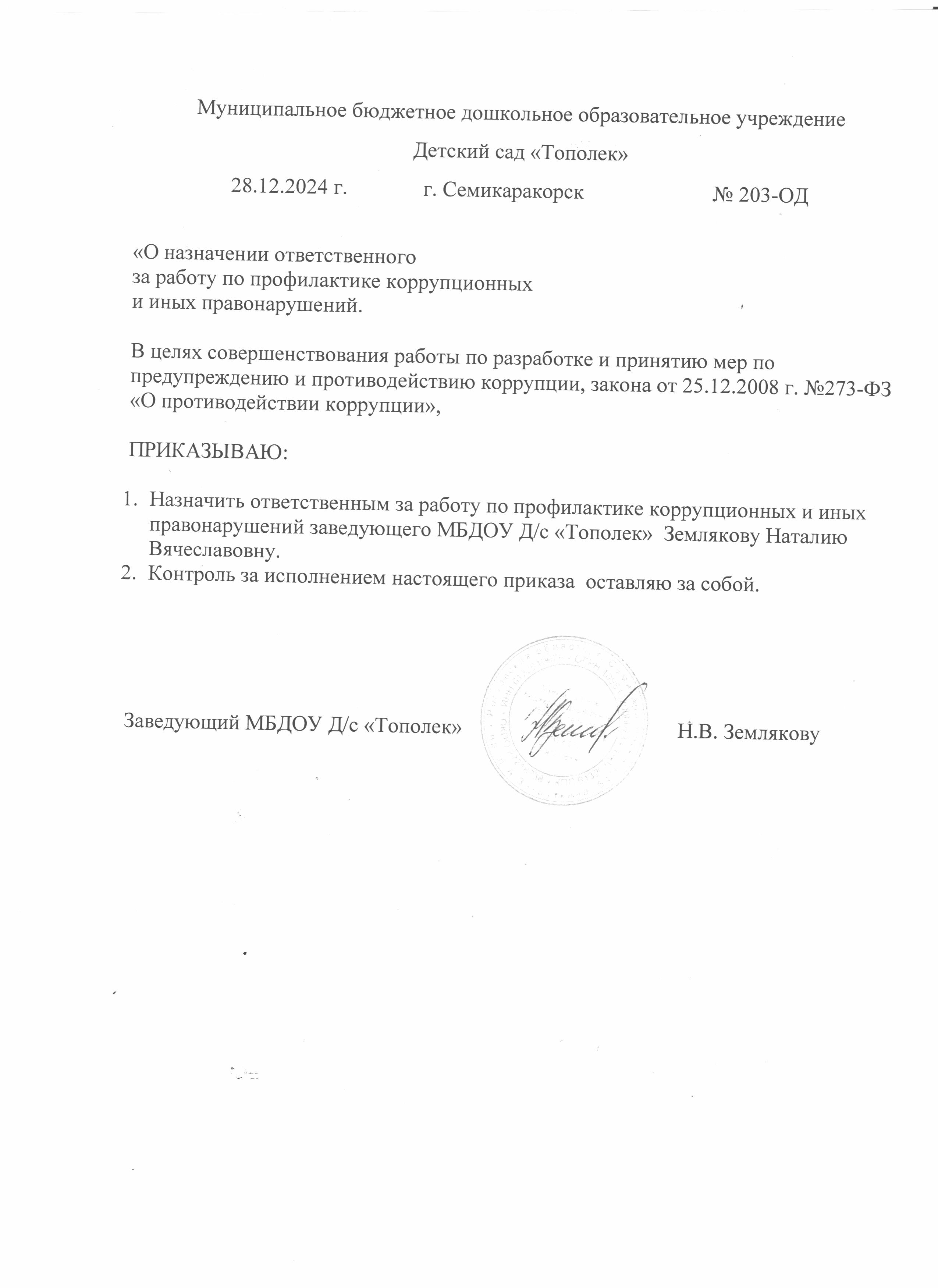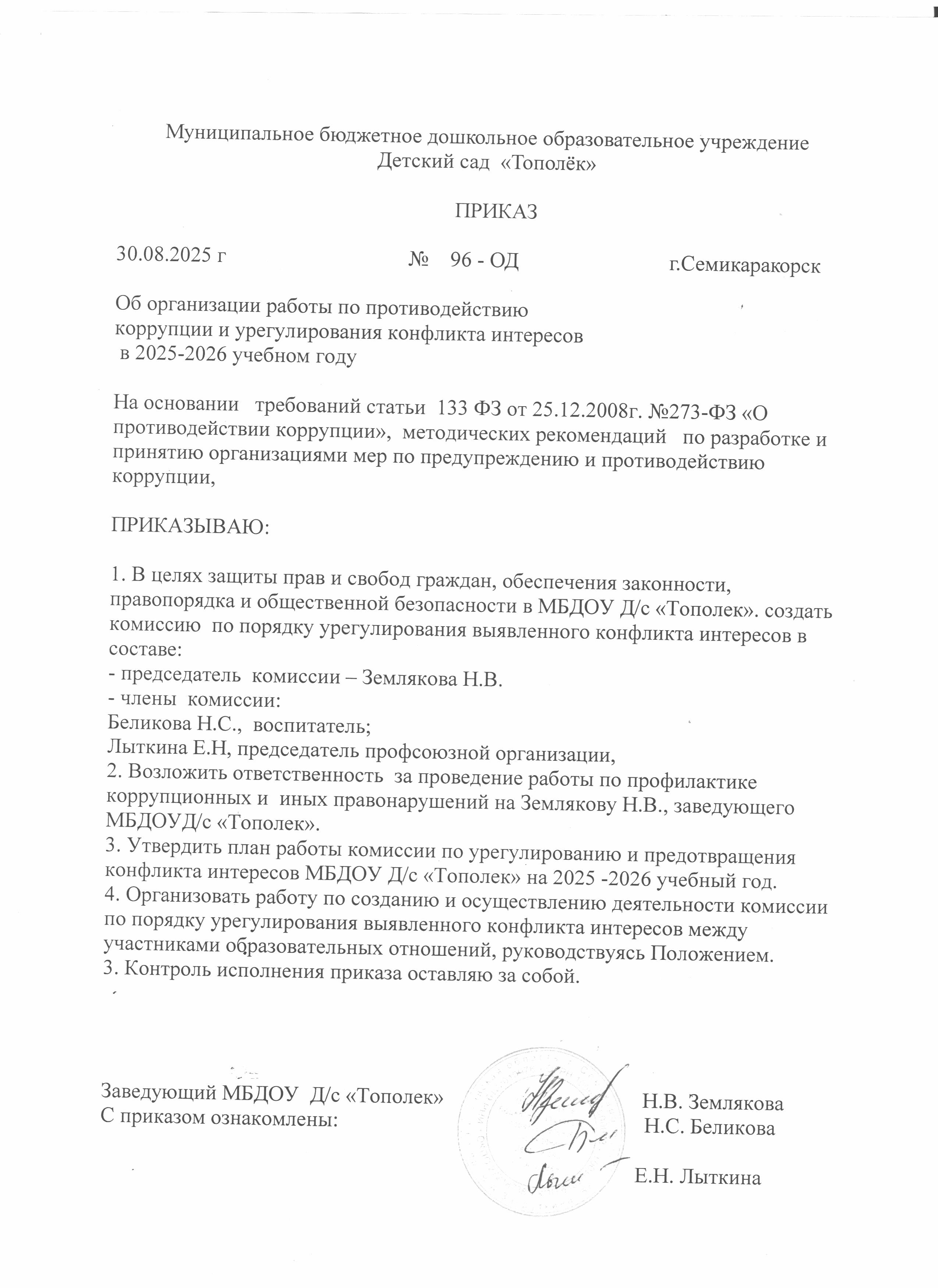Противодействие коррупции Антикоррупционная экспертиза ФЕДЕРАЛЬНЫЙ ПОРТАЛ ПРОЕКТОВ НОРМАТИВНЫХ ПРАВОВЫХ АКТОВ (скачать *.docx) Информация Информационное сообщение (скачать *.docx) Памятка «Если у Вас требуют взятку», (скачать *..pdf) Комиссия по соблюдению требований к служебному поведению и урегулированию конфликта интересов Комиссия (скачать *.docx) Локальные акты по противодействию коррупции приказ Об определении должностных лиц, ответственных за профилактику коррупционных или иных правонарушений (скачать *..pdf) Приказ по ДОУ от 29.08.2023 №149-ОД Об утверждении локальных нормативных актов по противодействию коррупции в МБДОУ Д/с «Тополек» (скачать *..pdf) Приказ по ДОУ от 30.08.2025 №96-ОД Об организации работы по противодействию коррупции и урегулированию конфликта интересов в 2025-2026 уч.г. (скачать *..jpg) Приказ по ДОУ от 30.09.2024 №152-ОД Об организации работы по противодействию коррупции и урегулированию конфликта интересов в 2024-2025 уч.г. (скачать *..jpg) Локальные нормативные акты. Положение о комиссии по противодействию коррупции (скачать *.docx) Положение о комиссии по профессиональной этике педагогических работников (скачать *.docx) Положение о конфликте интересов работников МБДОУ (скачать *..pdf) Положение о порядке рассмотрения обращений граждан (скачать *..pdf) Положение о профессиональной этике работников (скачать *.docx) Положение об оценке коррупционных рисков при осуществлении закупок (скачать *.docx) Порядок уведомления о фактах обращения в целях склонения работников к совершению коррупционных правонарушений (скачать *..pdf) Приказ от 28.12.24 г. №203-ОД О назначении ответственного за работу по профилактике коррупционных правонарушений (скачать *..jpg) Методические материалы и рекомендации Методических рекомендаций по разработке и принятию организациями мер по предупреждению и противодействию коррупции (скачать *..pdf) Рекомендации по соблюдению государственными (муниципальными) служащими норм этики в целях противодействия коррупции и иным правонарушениям (скачать *..pdf) Нормативные правовые и иные акты в сфере противодействия коррупции Постановление Правительства РФ №10 от 09.01.2014 (скачать *.docx) Постановление Правительства РФ №207 от 15.03.2013 (скачать *.docx) Постановление Правительства РФ №208 от 13.03.2013 (скачать *.docx) Постановление Правительства РФ №29 от 21.01.2015 (скачать *.docx) Постановление Правительства РФ №568 от 05.07.2013 (скачать *.docx) Приказ №490н Министерства труда и социальной защиты (скачать *..pdf) Указ Президента Российской Федерации от 01.07.2010 № 821 (скачать *.docx) Указ Президента Российской Федерации от 02.04.2013 № 309 (скачать *.docx) Указ Президента Российской Федерации от 08.07.2013 № 613 (скачать *.docx) Указ Президента Российской Федерации от 15.07.2015 № 364 (скачать *.docx) Указ Президента Российской Федерации от 16.08.2021 № 478 (скачать *.docx) Указ Президента Российской Федерации от 19.05.2008 № 815 (скачать *.docx) Федеральный закон № 172-ФЗ от 17.07.2009 (скачать *.docx) Федеральный закон № 230-ФЗ от 03.12.2012 (скачать *.docx) Федеральный закон № 273-ФЗ от 25.12.2008 (скачать *.docx) ОБРАТНАЯ СВЯЗЬ ДЛЯ СООБЩЕНИЯ О ФАКТАХ КОРРУПЦИИ Обратная связь (скачать *.docx) Отчеты Отчет о проведении оценки коррупционных рисков за 2023 г. (скачать *..pdf) Отчет о проведении оценки коррупционных рисков за 2024 г. (скачать *..pdf) Отчет о проведении оценки коррупционных рисков за 2025 г. (скачать *..pdf) Отчет об исполнении плана противодействия коррупции за 2022 год (ск