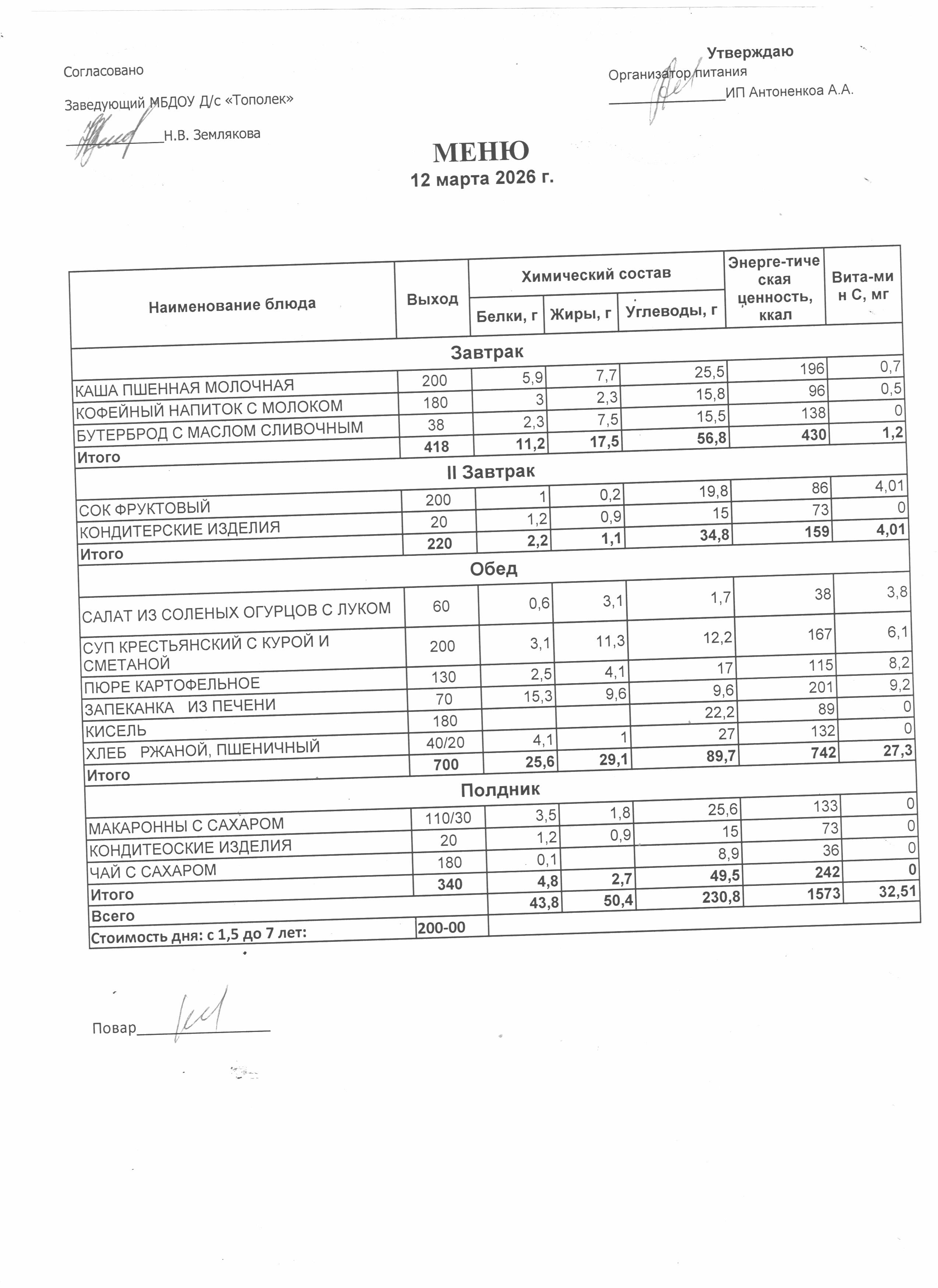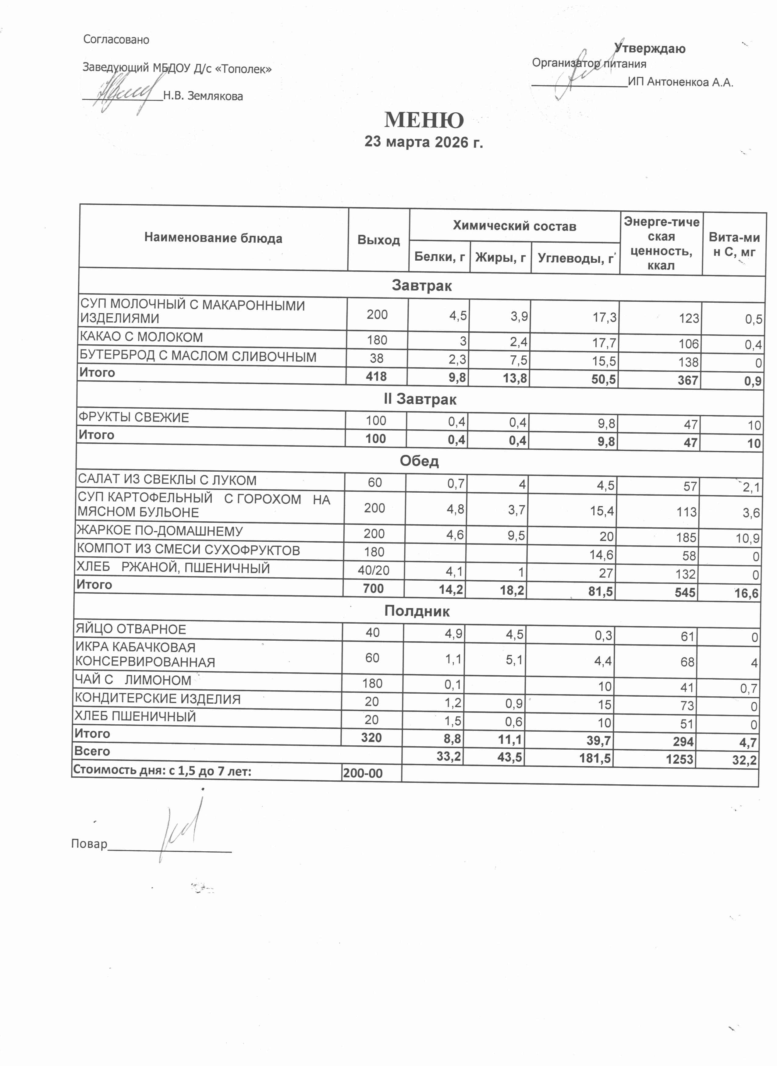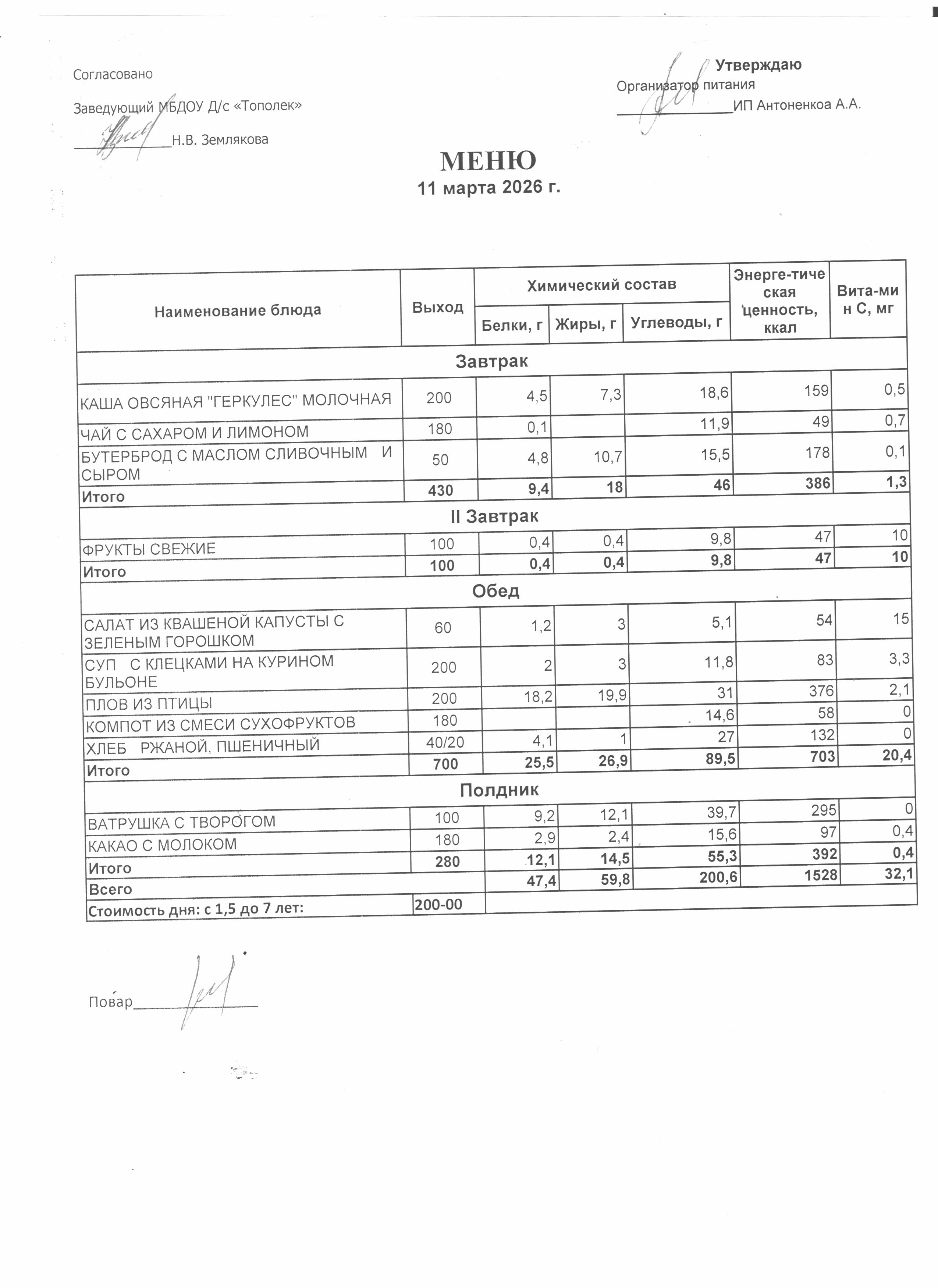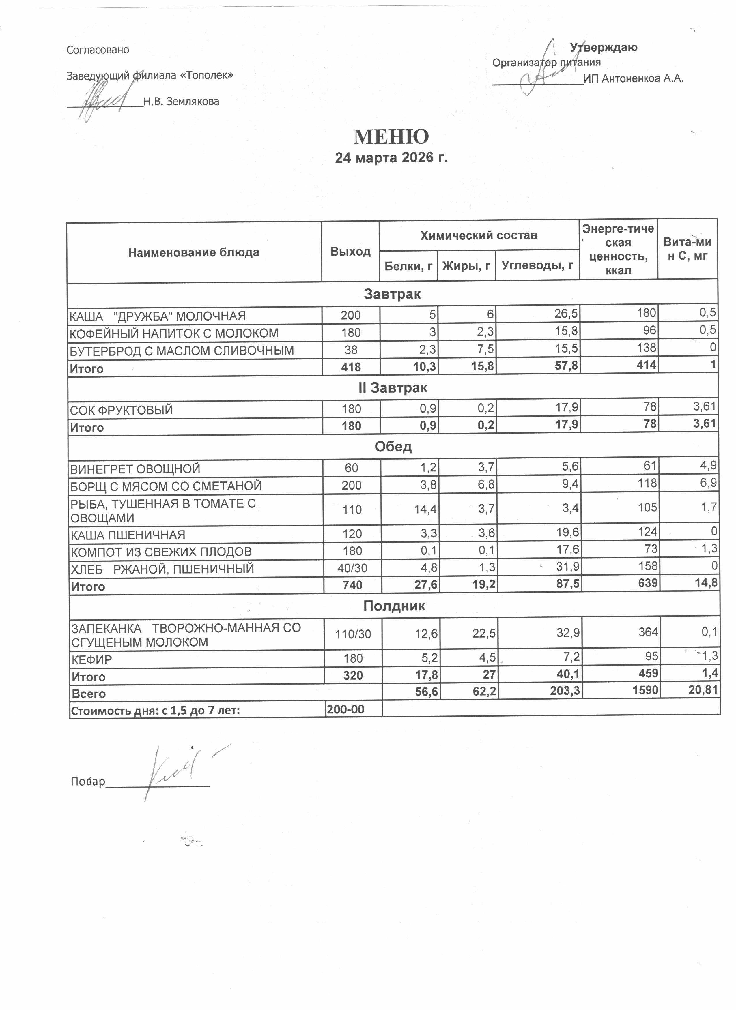 Организация питания в образовательной организации Условия охраны здоровья обучающихся РазвернутьСвернуть Наименование объектаАдресПлощадь, м2Количество местПриспособленность для использования инвалидами и лицами с ОВЗ Детский сад346630,Ростовская обл., г. Семикаракорск, пр-кт В.А. Закруткина,54/1324.9023Нет Условия питания обучающихся РазвернутьСвернуть Наименование объектаАдресПлощадь, м2Количество местПриспособленность для использования инвалидами и лицами с ОВЗ Детский сад346630,Ростовская обл., г. Семикаракорск, пр-кт В.А. Закруткина,54/1324.9023Нет Организация питания (скачать *.docx) Меню ежедневного горячего питания Десятидневное меню горячего питания (скачать *..pdf) Меню 11.03.2026 (скачать *..jpg) Меню 12.03.2026 (скачать *..jpg) Меню 13.03.2026 (скачать *..jpg) Меню 16.03.2026 (скачать *..jpg) Меню 17.03.2026 (скачать *..jpg) Меню 18.03.2026 (скачать *..jpg) Меню 19.03.2026 (скачать *..jpg) Меню 20.03.2026 (скачать *..jpg) Меню 23.03.2026 (скачать *..jpg) Меню 24.03.2026 (скачать *..jpg) Информация о наличии диетического меню Информация о наличии диетического меню (скачать *.docx) Перечни ЮЛ и ИП Перечень лиц,оказывающих услуги по организации питания (скачать *.docx)