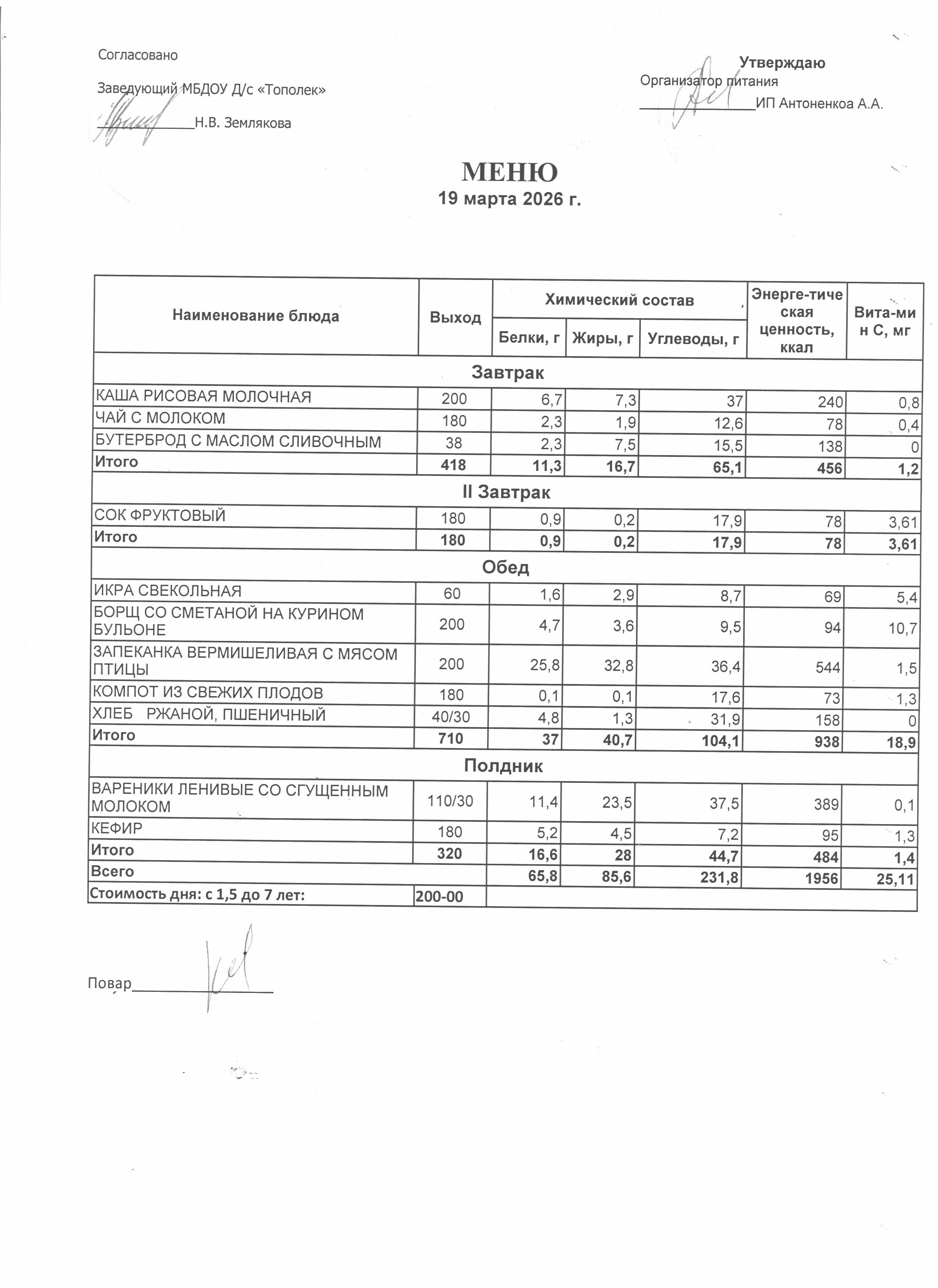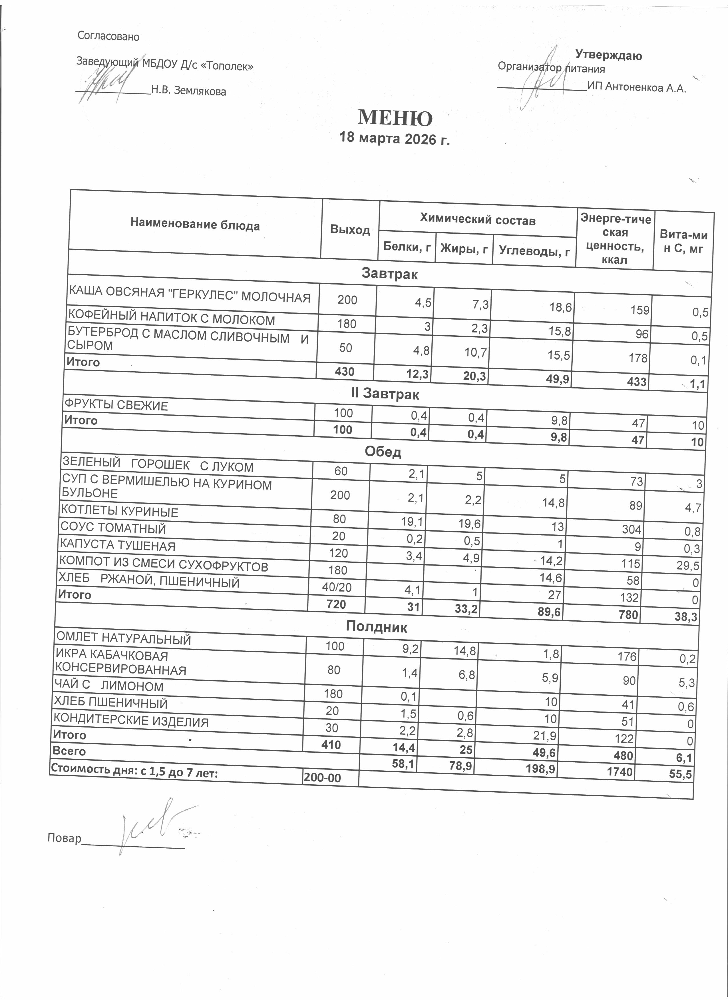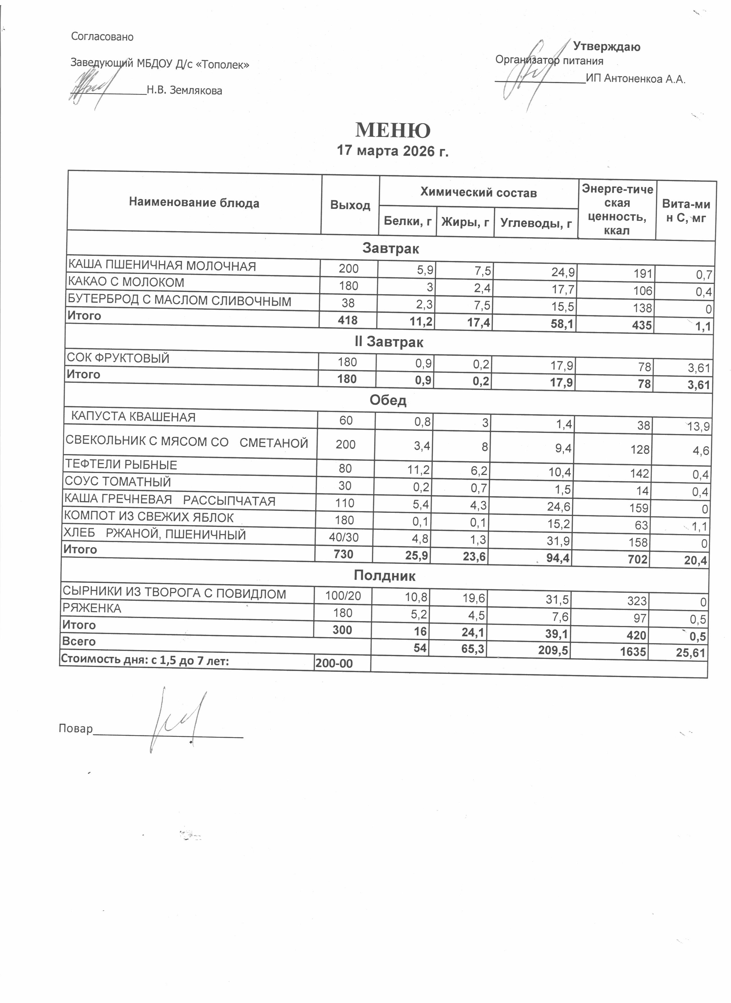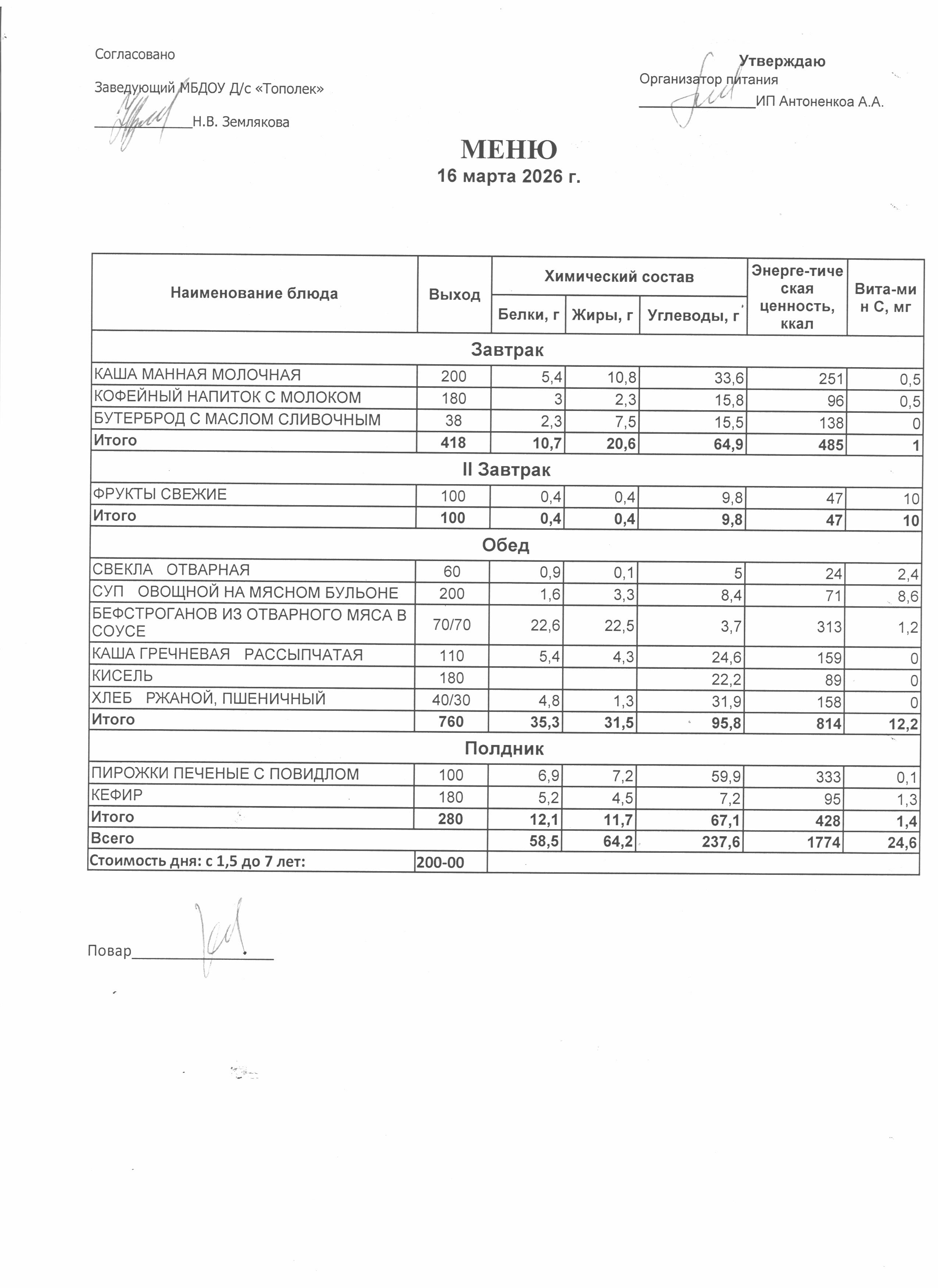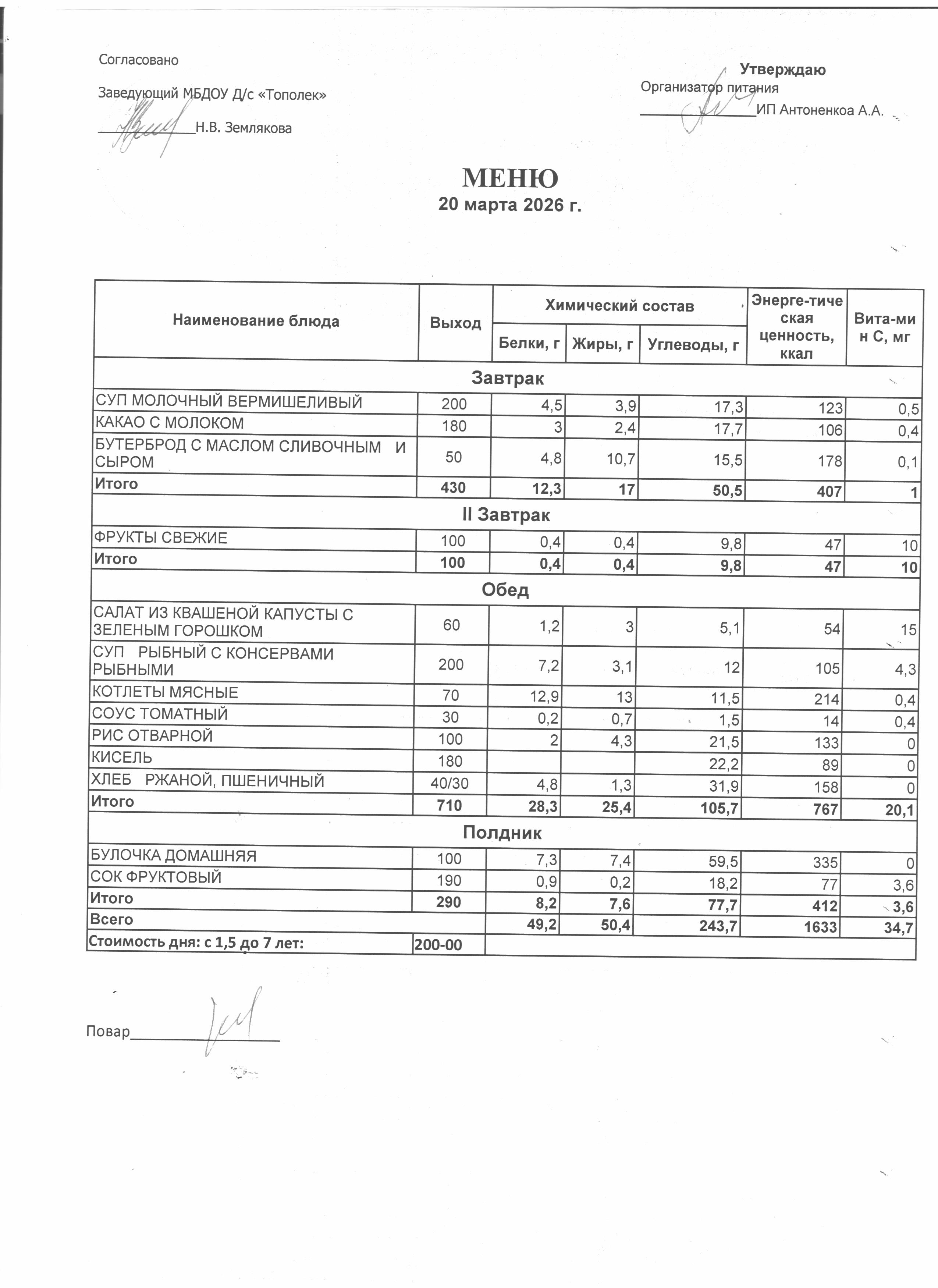 Организация питания в образовательной организации Условия охраны здоровья обучающихся РазвернутьСвернуть Наименование объектаАдресПлощадь, м2Количество местПриспособленность для использования инвалидами и лицами с ОВЗ Детский сад346630,Ростовская обл., г. Семикаракорск, пр-кт В.А. Закруткина,54/1324.9023Нет Условия питания обучающихся РазвернутьСвернуть Наименование объектаАдресПлощадь, м2Количество местПриспособленность для использования инвалидами и лицами с ОВЗ Детский сад346630,Ростовская обл., г. Семикаракорск, пр-кт В.А. Закруткина,54/1324.9023Нет Организация питания (скачать *.docx) Меню ежедневного горячего питания Десятидневное меню горячего питания (скачать *..pdf) Меню 11.03.2026 (скачать *..jpg) Меню 12.03.2026 (скачать *..jpg) Меню 13.03.2026 (скачать *..jpg) Меню 16.03.2026 (скачать *..jpg) Меню 17.03.2026 (скачать *..jpg) Меню 18.03.2026 (скачать *..jpg) Меню 19.03.2026 (скачать *..jpg) Меню 20.03.2026 (скачать *..jpg) Меню 23.03.2026 (скачать *..jpg) Меню 24.03.2026 (скачать *..jpg) Информация о наличии диетического меню Информация о наличии диетического меню (скачать *.docx) Перечни ЮЛ и ИП Перечень лиц,оказывающих услуги по организации питания (скачать *.docx)